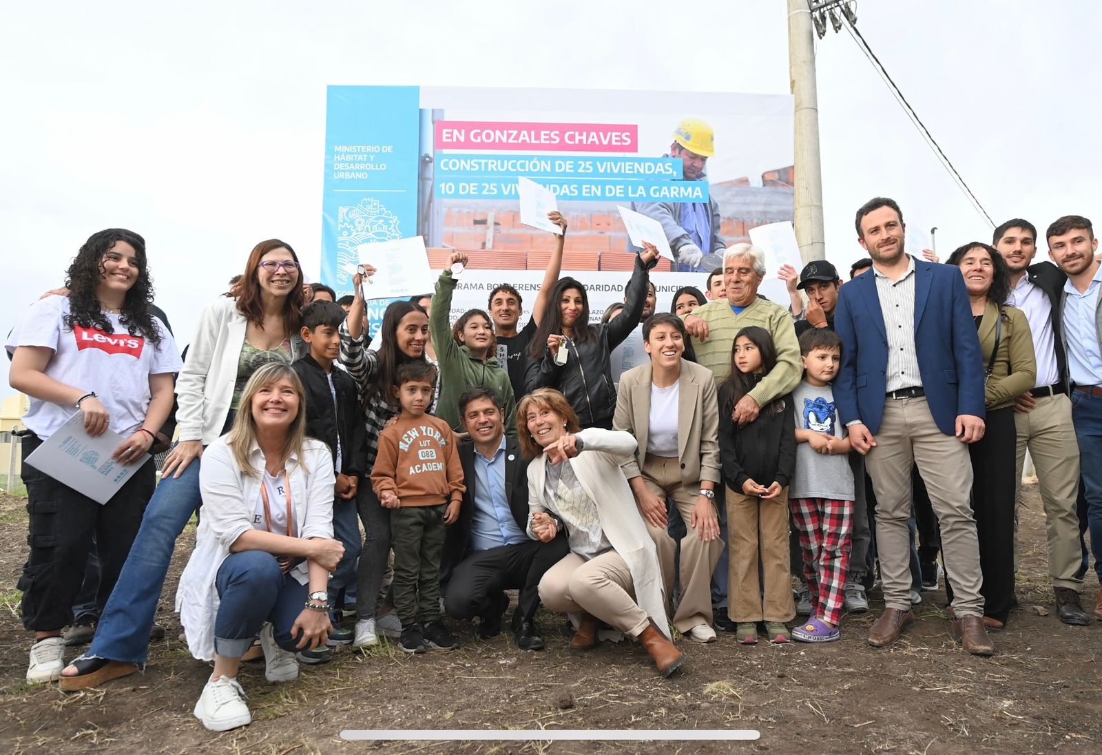 Finalmente, el acto central se llevó a cabo en el Polideportivo Municipal de Adolfo Gonzales Chaves, con una gran concurrencia de personas. Entre los asistentes destacados estuvieron la jefa de Asesores del Gobernador, Cristina Álvarez Rodríguez; el ministro de Infraestructura y Servicios Públicos, Gabriel Katopodis; el administrador General del Instituto de la Vivienda, Diego Menéndez; y el subadministrador Hernán Ralinqueo. También estuvieron presentes la escribana general de Gobierno, Paula Sidoti; la subsecretaria de Política Ambiental, Tamara Basteiro; los directores provinciales de Coordinación de Gestión Territorial Interior Sur de la Jefatura de Asesores del Gobernador, Gabriel Godoy; y de Vinculación con el Sistema Universitario y Científico, Juan Brardinelli, el secretario ejecutivo del Instituto de Lotería y Casino de la Provincia, Marcelo Santillán; la senadora provincial Ayelén Durán; los intendentes de Tres Arroyos, Pablo Garate; de Benito Juárez, Julio Marini; y de Laprida, Alfredo Fisher; la Presidenta del Consejo Nacional de Coordinación de Políticas Sociales Marisol Merquel; el director del CAPS, Gustavo Leguizamón; la directora del Hospital Anita Eliçagaray, Gabriela Gil; concejales y concejalas; y funcionarios locales.